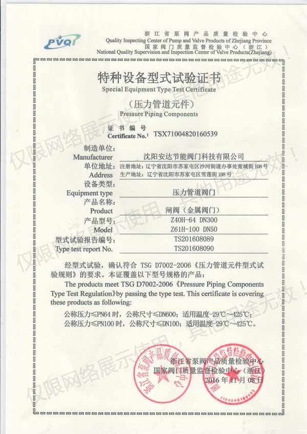 中華人民共和國特種設備只奧許可證(壓力管道閥門)